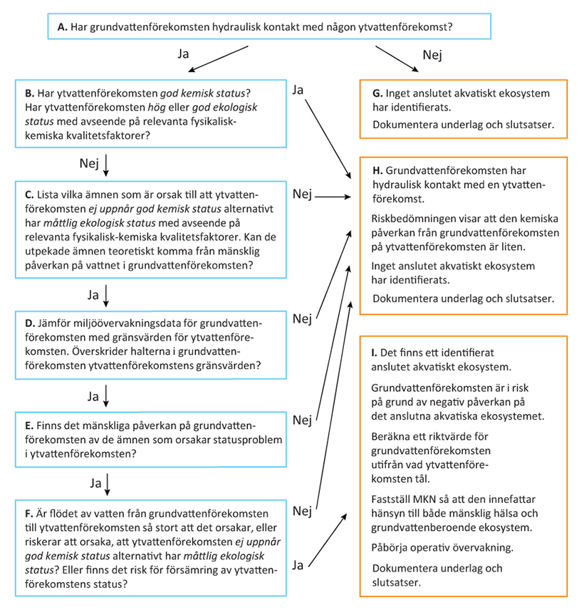 Flödesschemat visar frågeställningar att arbeta med vid bedömning av kemisk påverkan på anslutna akvatiska ekosystem i ytvattenförekomster. För varje ruta finns en förklarande text, se respektive bokstav. För att förenkla förståelsen av exemplet i flödesschemat har det antagits att grundvattenförekomsten endast har kontakt med en ytvattenförekomst. I verkligheten kan en grundvattenförekomst ha kontakt med flera ytvattenförekomster. Om så är fallet får frågorna i de olika stegen besvaras för varje ytvattenförekomst.