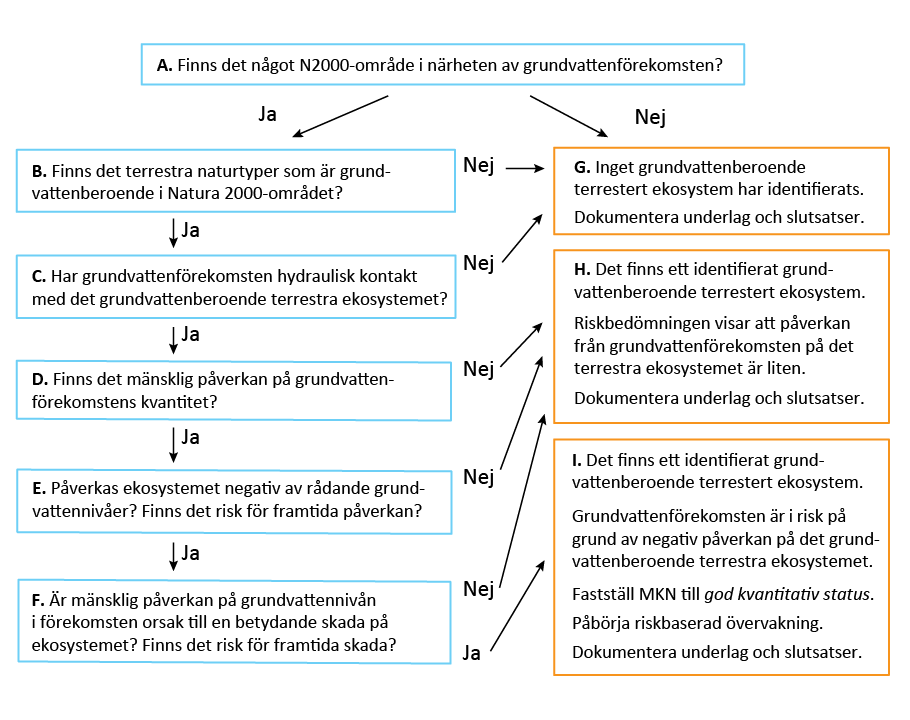 Flödesschemat visar frågeställningar att arbeta med vid bedömning av kvantitativ påverkan från en grundvattenförekomst på grundvattenberoende terrestra ekosystem. För varje ruta finns en förklarande text, se respektive bokstav. För att förenkla förståelsen av exemplet i flödesschemat har den antagits att grundvattenförekomsten endast har kontakt med ett grundvattenberoende terrestert ekosystem. Om en grundvattenförekomst har kontakt med flera grundvattenberoende terrestra ekosystem får frågorna i de olika rutorna besvaras för varje ekosystem.