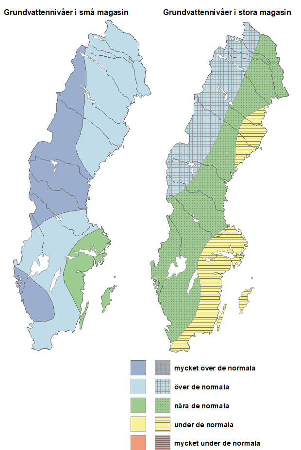 I de stora grundvattenmagasinen är nivåerna över de normala i västra Norrland. I de östra delarna av Norrland, Svealand och Götaland är nivåerna under de normala, medan resterande delar av landet har nivåer nära de normala.