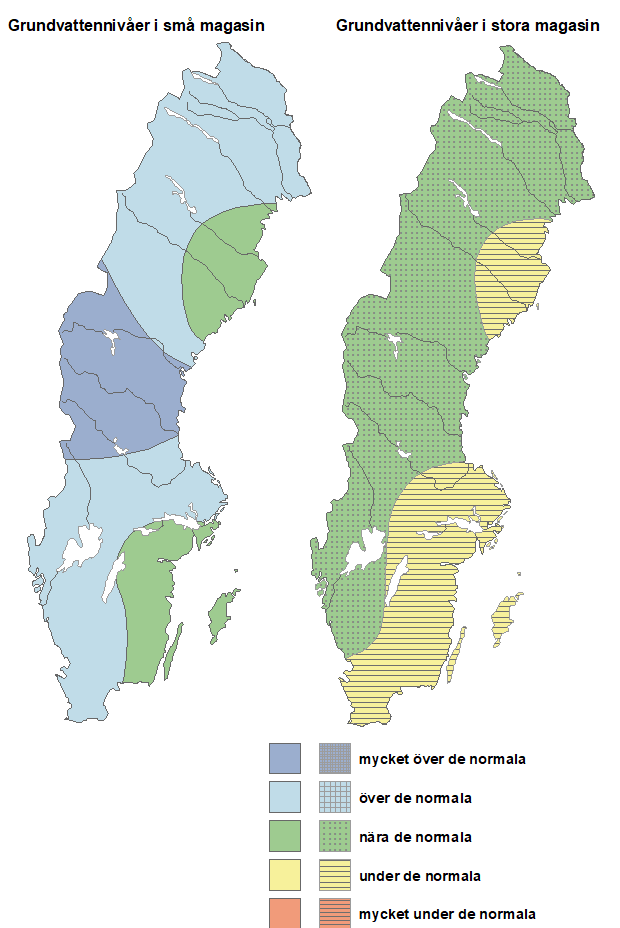 Grundvattennivåerna i de små magasinen är normala eller över de normala i hela landet. I de stora magasinen har en viss återhämtning noterats: i östra och södra delarna av landet är nivåerna fortfarande under de normala medan läget är tämligen normalt i övriga landet.